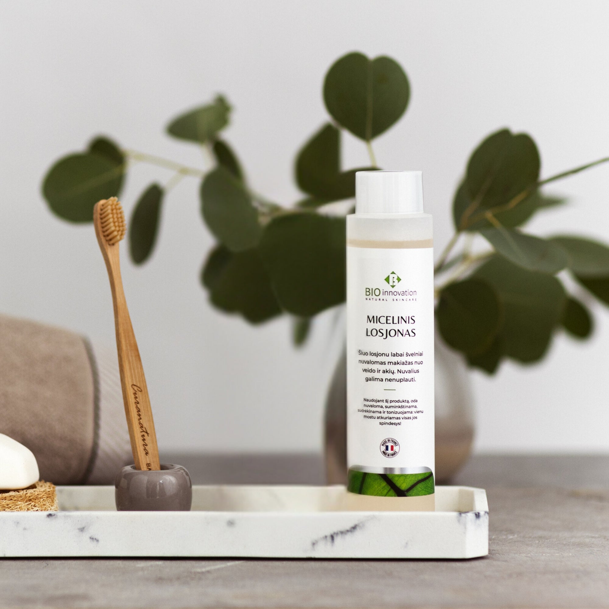Micelinis losjonas, pagamintas Prancūzijoje, efektyviai valo, ramina, drėkina ir tonizuoja odą, suteikdamas jai visapusišką priežiūrą. Jo micelės švelniai surenka makiažo daleles ir nešvarumus, puikiai nuvalydamos subtilias veido ir akių sritis. Natūralus medetkų vanduo, cukrus ir fukozė, esantys šio produkto sudėtyje, neleidžia odai sudirgti, todėl išvalyta ir nuraminta oda tampa atsparesnė kasdieniams teršalams. Alavijas užtikrina optimalų drėgmės lygį, o augalo polisacharidai prisideda prie odos minkštumo ir apsaugos. Gaivus rožių ir apelsino žiedų vanduo atnaujina ir skaistina odą, suteikdamas jai spindesio. Naudojant šį produktą, oda nuvaloma, suminkštinama, sudrėkinama ir tonizuojama, o jos spindesys atstatomas akimirksniu.